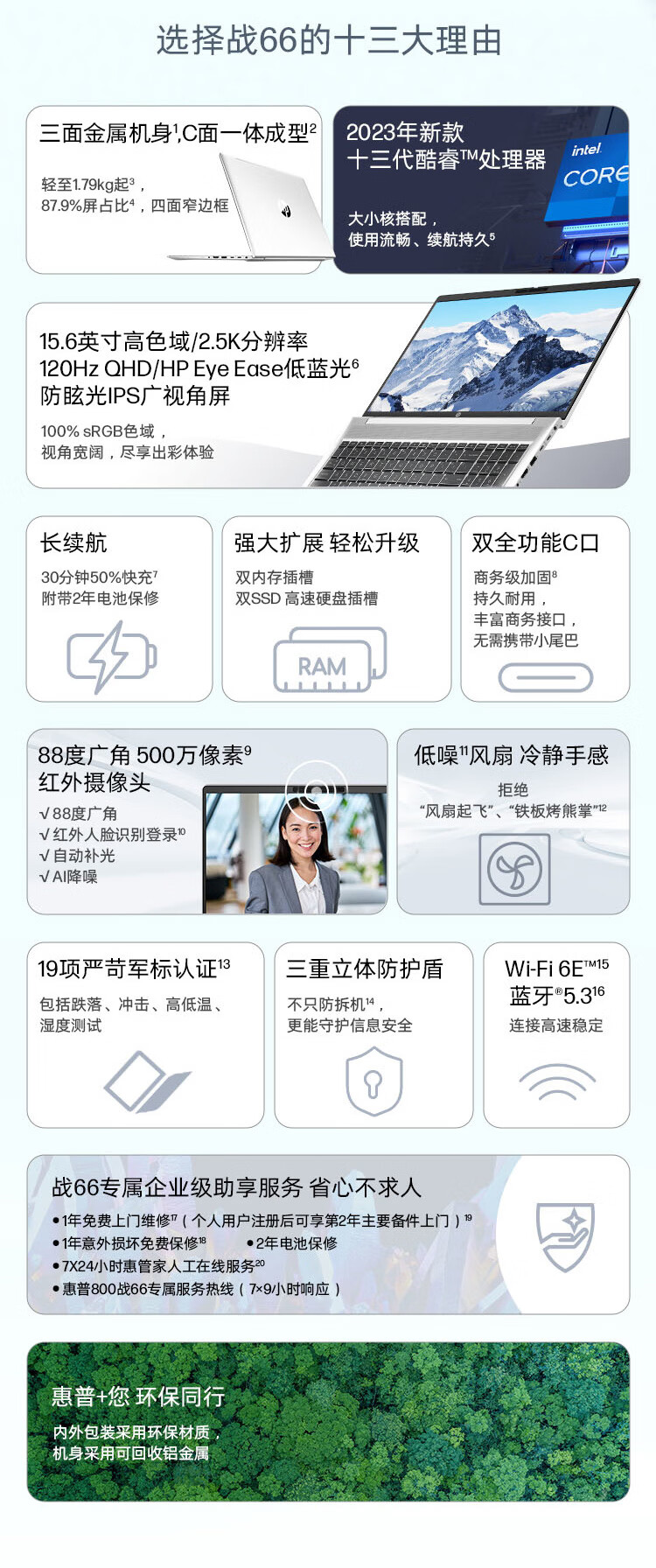 惠普(HP)战66六代2023酷睿15.6英寸(英特尔13代i5-1340P16G1T2.5K高色域屏120HZ)高性能轻薄本笔记本电脑